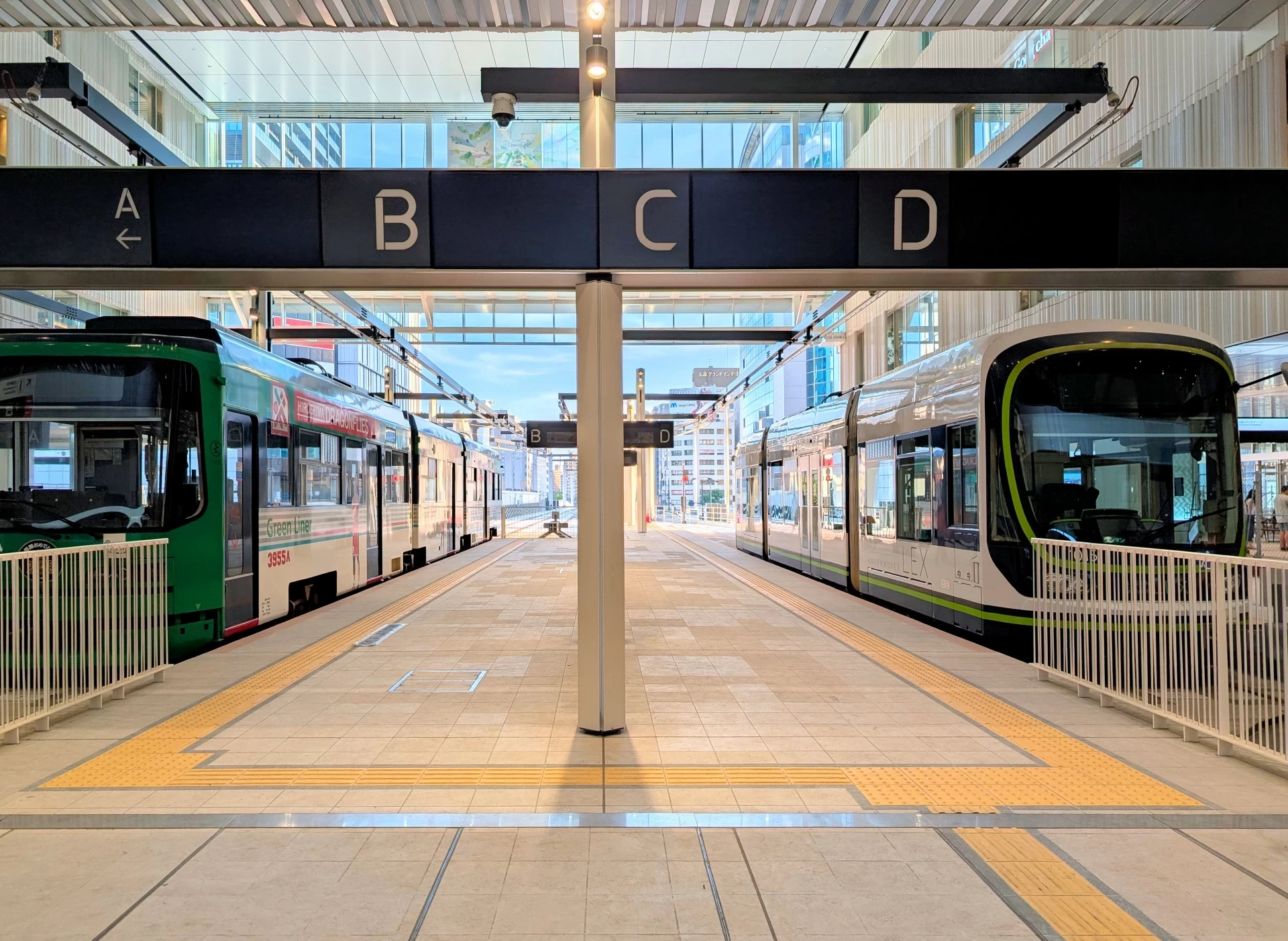 搭乘廣電時,首先要前往電車候車站。路面電車的特點是,鋪設在汽車行駛道路上的專用軌道,與汽車共用道路行駛。因此,多數電車站都像公車站一樣設置在路邊。像這次在廣島開通的 「車站前大橋路線」,電車直接進入車站大樓的情況,則屬於特殊例子。當電車靠近電車站時,一定要確認行駛方向。前車廂前方上方會像公車一樣顯示行駛目的地。由於廣島市內有多條路線運行,搭乘前務必確認路線號碼與目的地是否正確,以免搭錯車。