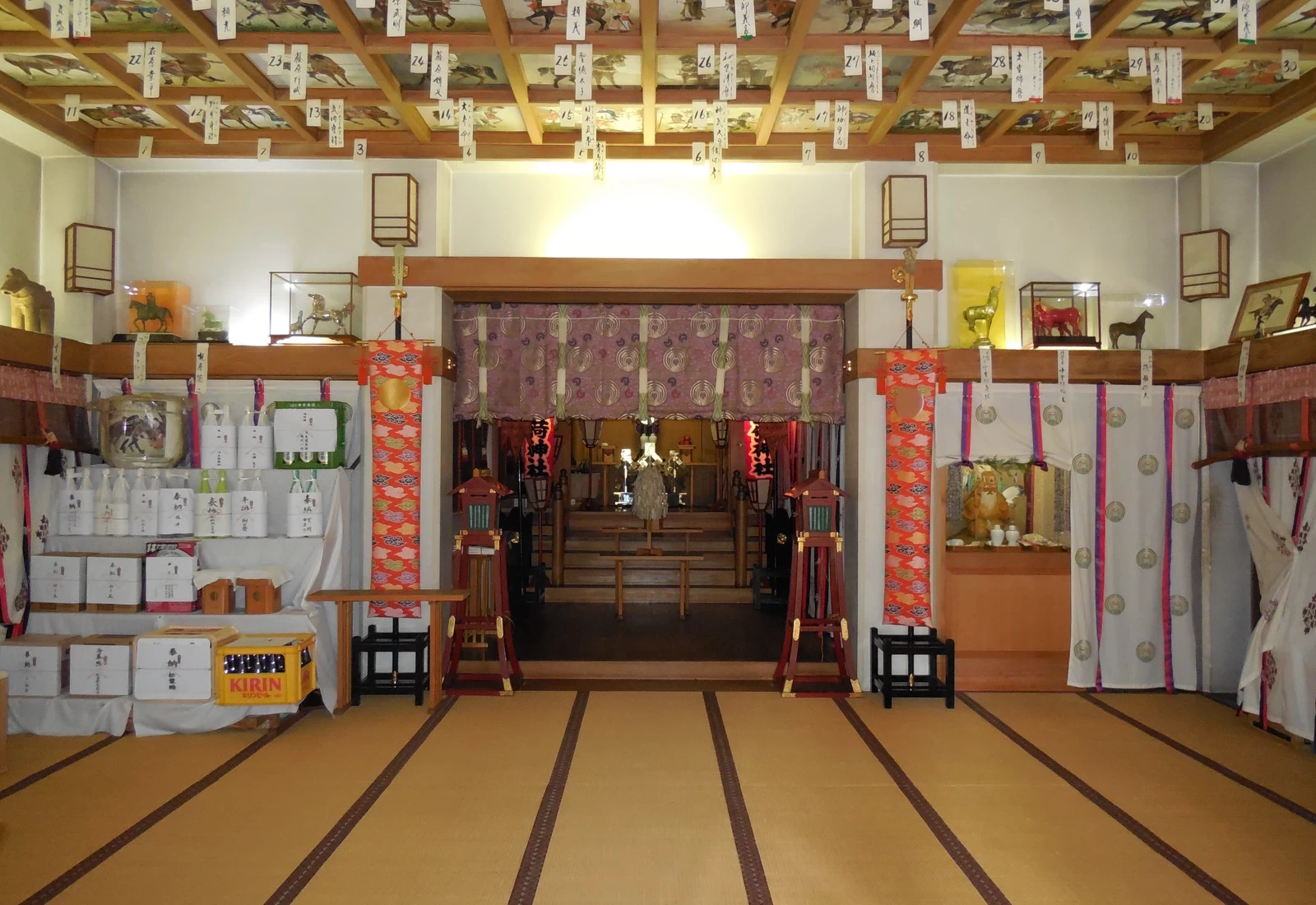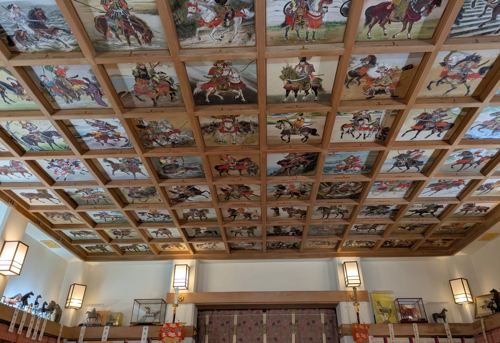 此處最大的看點,是社殿格天井上所裝飾的「騎馬繪」。自神武天皇時代至現代的馬上英姿盡現,人物、馬匹、武器與服飾皆描繪得極為精緻,約百幅畫作鋪滿整座天花板,壯觀景象令人嘆為觀止。