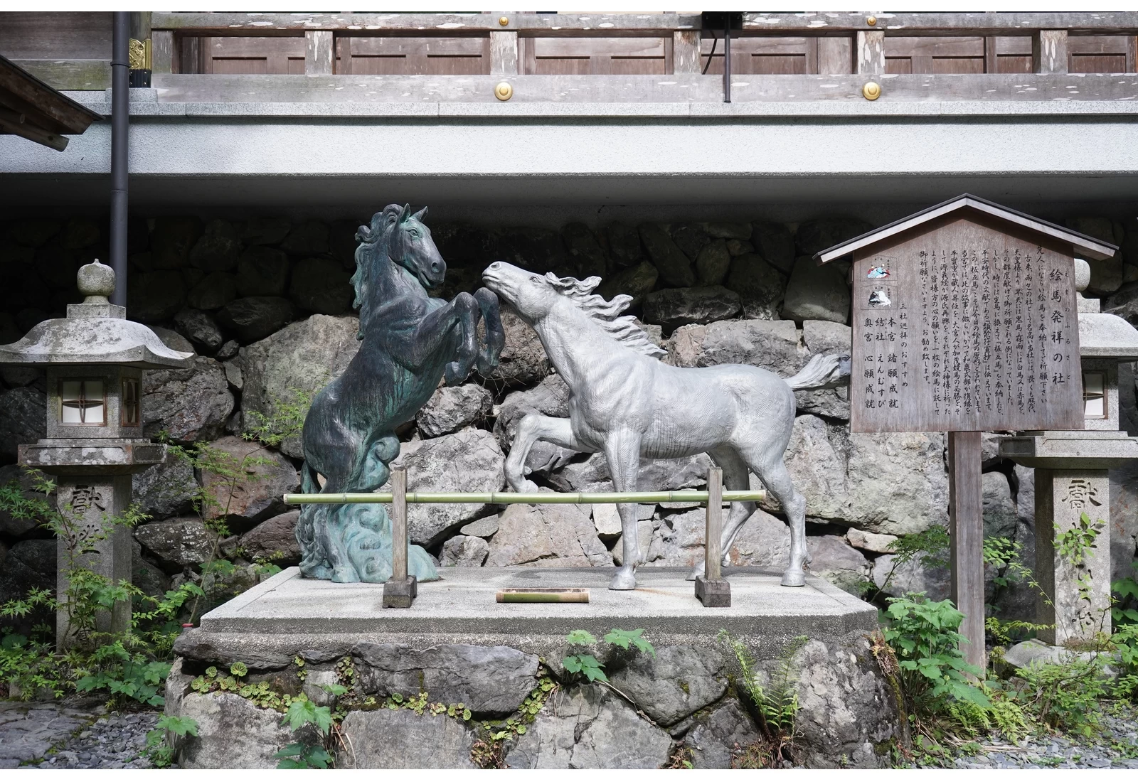 本宮內設有黑、白兩匹馬的雕像,自古以來便與馬有深厚淵源。據記載,在朝廷時代,若祈求降雨便奉獻「黑馬」,祈求止雨則奉獻「白馬」或「赤馬」。此外,神社內還有供奉結緣之神的「結社」,以及散發神秘氣息、被視為創建之地的「奧宮」,景點豐富,值得細細探訪。