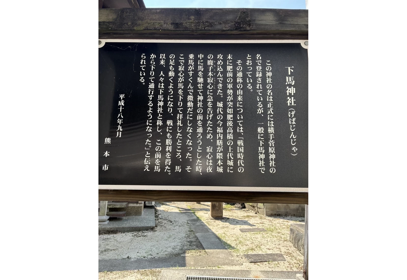 「下馬神社」又名「橫手菅原神社」,供奉以學問之神聞名的菅原道真公。相傳熊本城主鹿子木寂心(かのこぎじゃくしん)在出征途中,坐騎突然停下不動,他遂下馬參拜此神社,結果馬匹重新啟程,並最終贏得戰事,因而得名「下馬神社」。
