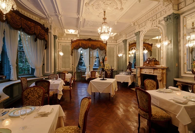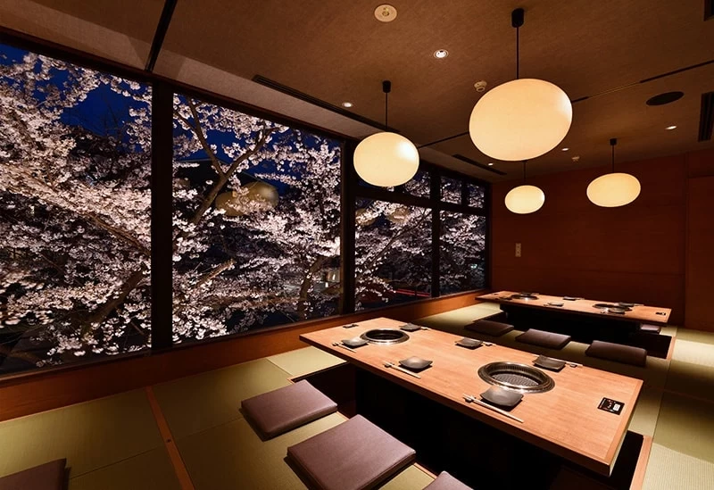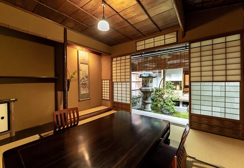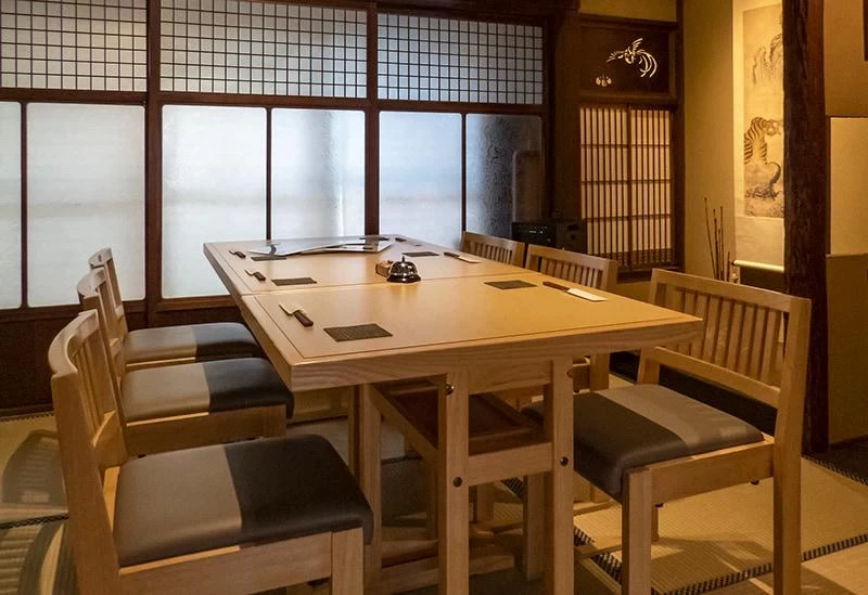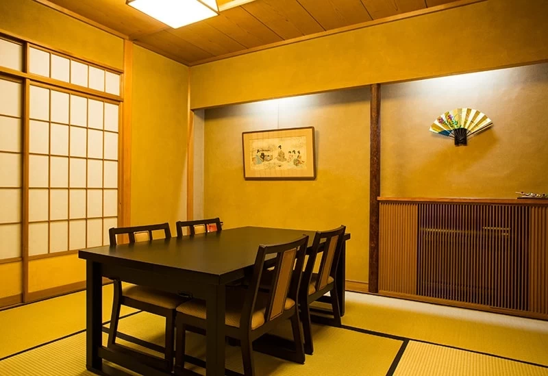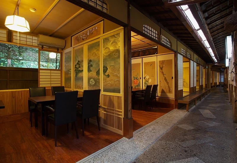 在充滿京都風情的和式空間內,設有可容納多達 50 人的包廂。此外,這裡也提供預約舞妓陪同用餐的服務,能夠一邊品嚐佳餚,一邊體驗傳統的「座敷遊」。