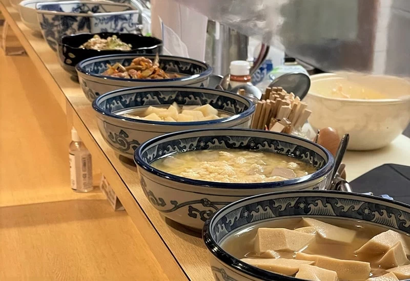 菜單選擇豐富,包含「豆皮烏龍麵」「咖哩烏龍麵」「肉烏龍麵」「冷拌烏龍麵」等,另有附上柴魚拌飯、烏龍麵、單品小菜與漬物的套餐組合,也深受好評。