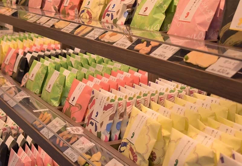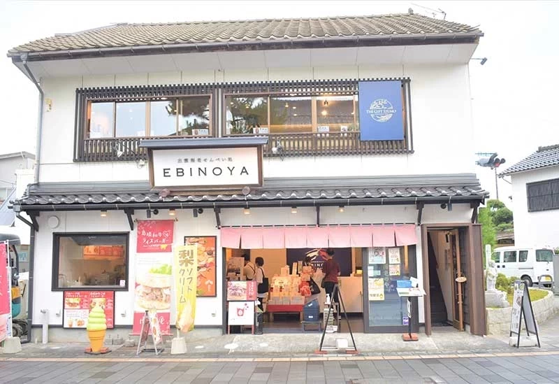 位於出雲大社神門通上的 EBINOYA,是一間帶有古民家風格的蝦仙貝專賣店,醒目的白牆搭配紅色布簾十分吸睛。店內陳列著約40種色彩繽紛、造型可愛的蝦仙貝,包括愛心形狀的「結緣仙貝」、使用島根和牛或蜆製成的特色口味等,都是人氣伴手禮選項。其他如「喉黑魚(のどぐろ)」和「紅薯」口味也非常受歡迎,讓人每種都想帶回家。