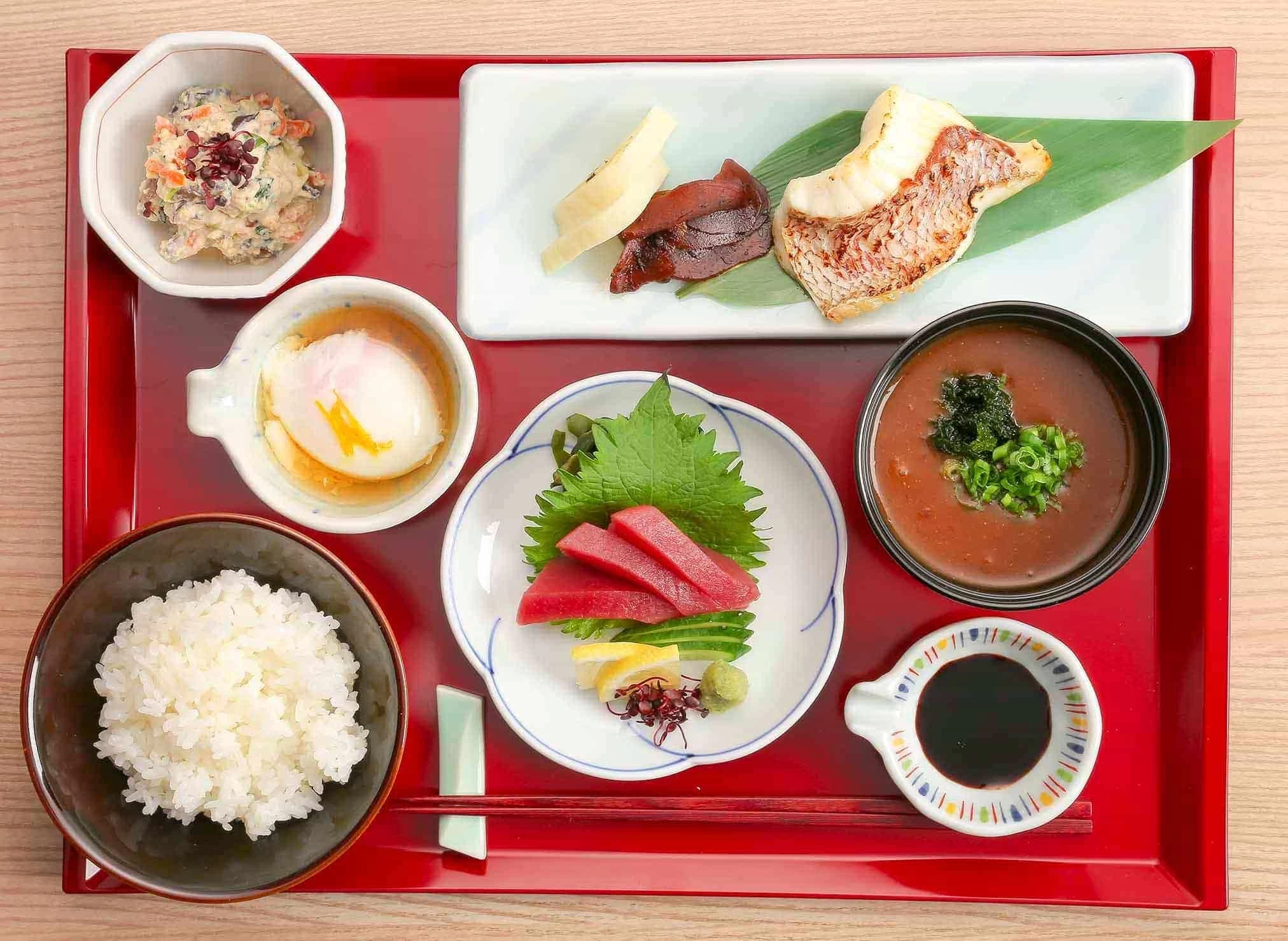 「近畿大学水産研究所 はなれ」提供的是以近畿大學培育的稚魚,交由日本各地業者養殖而成的「近大生魚類」料理。在這裡可以品嚐到大量使用近大生魚類製作的海鮮丼、壽司、烤魚等講究的魚料理。其中最推薦的是「近大紅白手桶壽司」,大量使用鮪魚、真鯛與鰤魚,不僅美味,紅白配色的外觀也充滿喜氣。