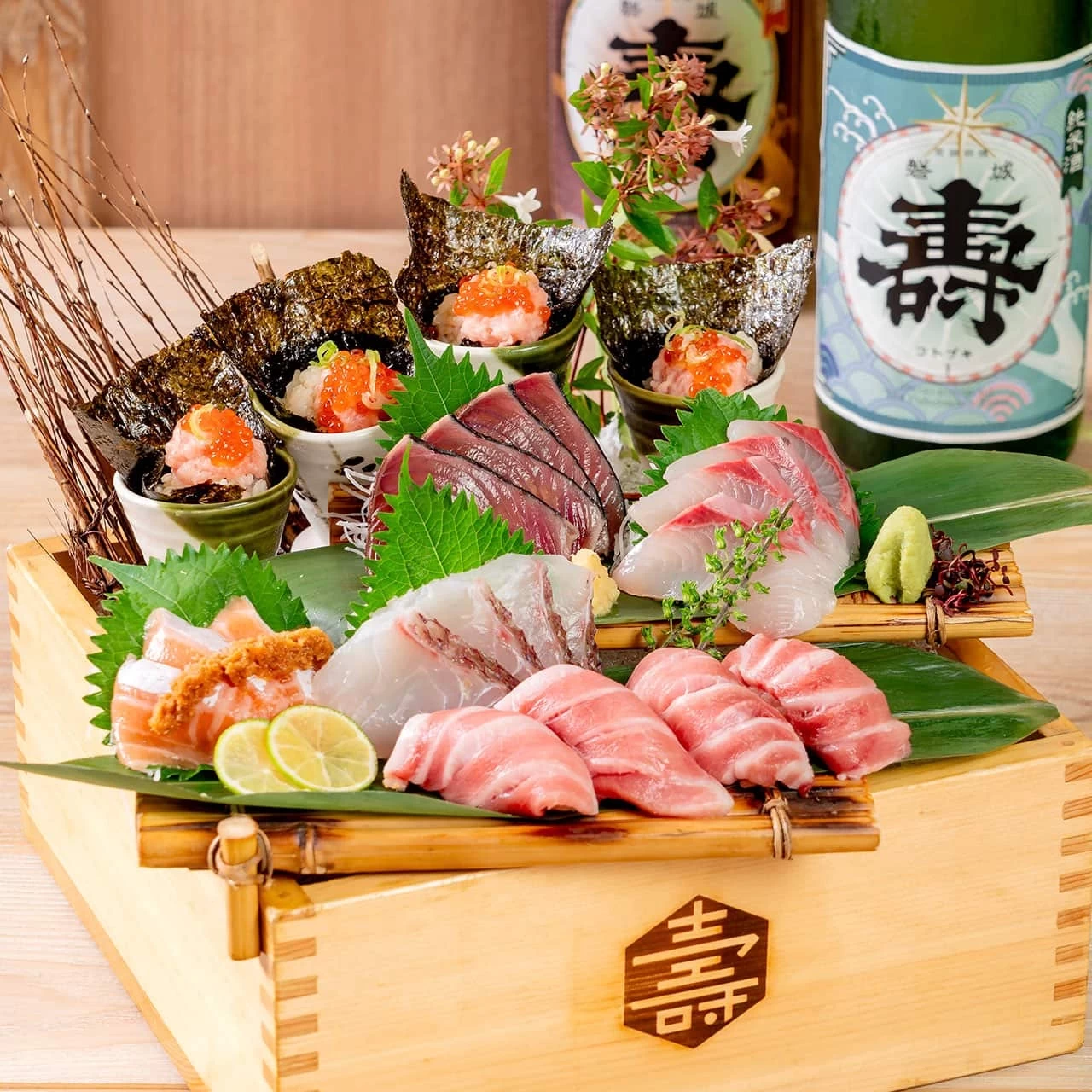 「東京 壽」的招牌特色在於使用漁港直送的新鮮漁獲所製作的各式魚料理,以及從日本全國各地嚴選而來、種類豐富的日本酒。特別推薦能一次品嚐當日現撈鮮魚的「壽海鮮拼盤」,不僅有各式生魚片,還包含本鮪魚的大腹握壽司,相當豪華。為了能與美酒完美搭配,店內的下酒卷物都事先調味,建議不沾醬油,直接搭配酒一起享用。像是鹽漬魚卵、真鯛酒盜拌、山椒鰻魚玉子燒、鮪魚蔥花卷等,都是讓人越吃越想喝酒的美味選擇。除了海鮮料理之外,店內也提供多款「東京風味料理」,例如使用江戶味噌燉煮的牛筋,以及以常盤醬汁調味的東京炒麵,菜色相當豐富。