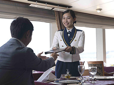 在主餐廳或包廂中細細品味法式與義式套餐,走上甲板,當船身穿越彩虹大橋的瞬間,更能感受到震撼人心的臨場感。自啟航以來約30年,這艘船始終靜靜陪伴著人們在人生轉折的重要時刻,或是與摯愛加深情感的珍貴時光。「也有不少客人當年在船上求婚,之後成為幸福夫妻再度回到船上搭乘呢。」如此分享的是負責旅客服務的菅沼小姐。有時他們也會協助拿捏求婚時機,能參與這些人生的重要片刻,對工作人員而言也是無比珍貴的喜悅。