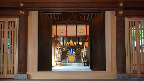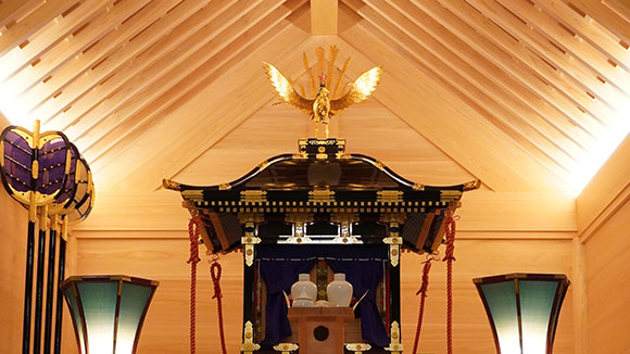 隨著象徵「鳳凰像」輝耀的新造「御鳳輦」,增建了安置祈禱儀式的儀式殿。儀式殿外觀莊嚴華麗,內部則針對神明的視角,由宮大工傾注高超技藝及細心呵護,成為一處美麗的社殿。初代加賀藩主前田利長公所作的詩句「鳳凰鳴矣,于彼高崗」而得名的地名「高岡」。歷經時光流轉,鳳凰優雅地舞降於高岡城遺址。