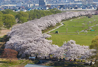 全國來自賞花客人潮涌動的「北上展勝地櫻花祭」。在活動期間裡,遊覽馬車穿梭於林蔭道上,大約有300隻鯉魚旗在空中悠游。夜晚時,櫻花大道被燈光照亮,映襯在河面上的盛開櫻花美不勝收。