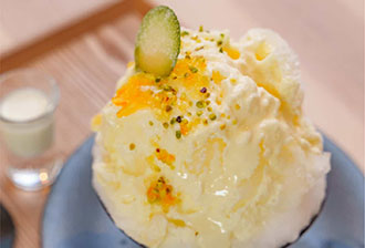 在「晴天音」咖啡館,您可以使用露台座位上的足湯。推薦的是覆有山口縣產水果醬的刨冰。刨碎後放入馬克杯型容器中的刨冰,可以在融化後像奶茶或可可一樣飲用,一次可以享受兩種口味的巧妙設計很有趣。