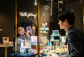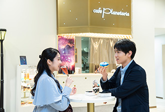 附設的咖啡廳提供拍照效果佳、包裹銀河的藍色甜甜圈以及以星雲為意象的紫色霜淇淋,還有依季節與作品推出的期間限定飲品與甜點等多樣迷人菜單。彷彿在銀河旅行中途停留,增添“宇宙氛圍”。