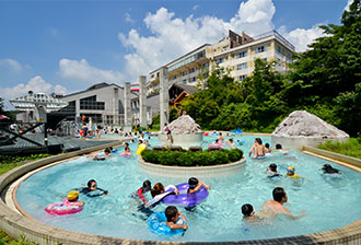 按摩浴缸、洞穴浴池、塑形浴池等娛樂設施齊全的「アクア・ヴィーナス」是夏季期間限定開放的戶外溫泉泳池。暑假期間,從小孩到大人,家庭成員熱鬧非凡。還可以享受「北投石」「岩盤浴椅」等桑拿設施。