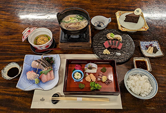 在獲得米其林兩星的京料理名店修業經驗的料理長所烹製的料理中,特別推薦用細心熬製的高湯和白味噌為基底的湯汁煮燉炭火燒野豬肉的「炭火燒野豬鍋御膳」。也能品嘗到盛有鞍馬地區萌芽的木芽煮的鯖魚壽司。