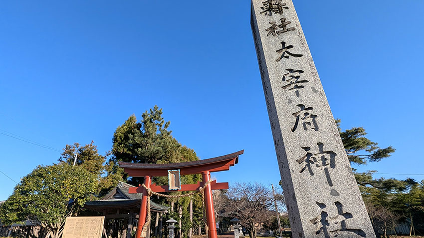 - 前身是鎮座於大寶寺城(後來的鶴岡城)內的城內天神「太宰府神社」。在戰國時代作為學問、豐收、避災之神受到崇敬。